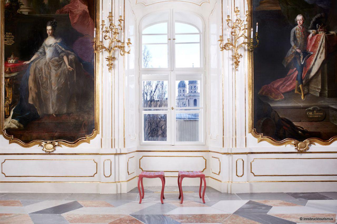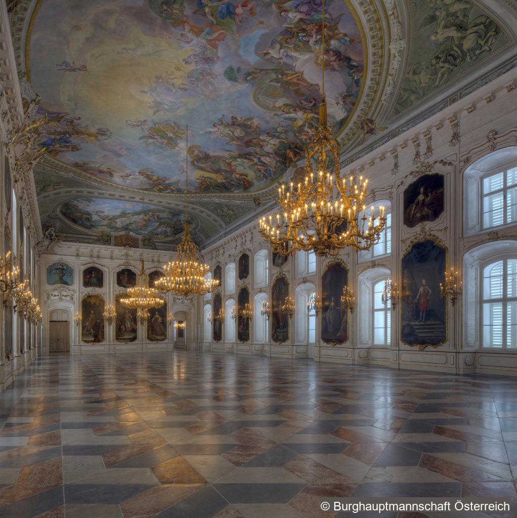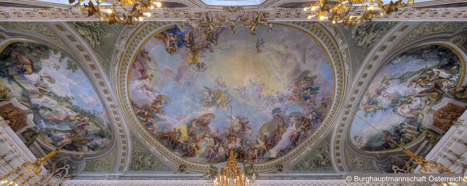 The painted ceiling, including the painted stucco, covers an area of c. 500 square metres and is one of Franz Anton Maulbertsch’s major works. The empress personally contributed to its design. The central fresco shows an allegory of the union of the royal houses of Austria and Lorraine, the flanking ovals depict the regalia of Tyrol. The marriage of the houses of Austria and Lorraine is depicted as a chariot, accompanied by personifications of the sovereign’s virtues.
