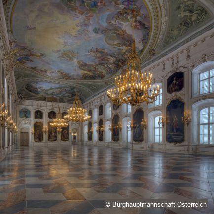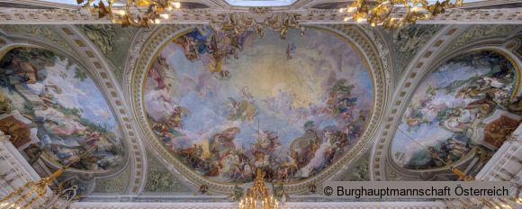 The “Riesensaal”, whose name is derived from an earlier cycle of Hercules paintings, together with the court chapel, is the second room dedicated to the memory of Emperor Franz I and designed according to the model of the Grand Gallery in Schönbrunn Palace. The banqueting hall extending across the whole width of the wing on Rennweg encompasses two storeys and seven window axes. It is furnished in honour of the House of Habsburg. The huge fresco panels depict allegories, the oil paintings the family of the imperial couple.