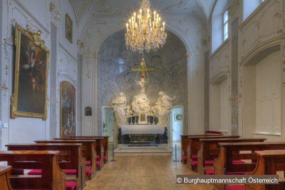 On the order of Maria Theresa the room in which the emperor died in August 1765 was converted into a memorial chapel by Pacassi and an endowment for ladies of rank was founded in his honour. The hall, structured with pilasters, is adorned with gentle rocaille stucco of which the tribune features a painted relief group of God the Father with mourning angels from Franz Anton Leitensdorffer (1721–95).
