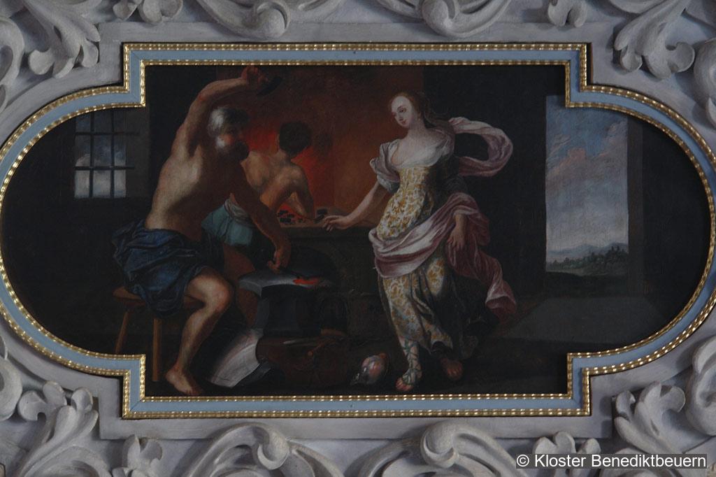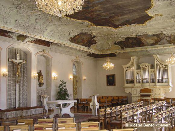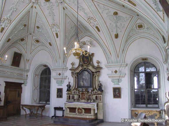 Because of its stuccoed stellar vault the oratory of the monks is counted as one of the most beautiful early Baroque rooms in Old Bavaria. A round dance of angels in its centre presents the instruments of passion of Christ.
