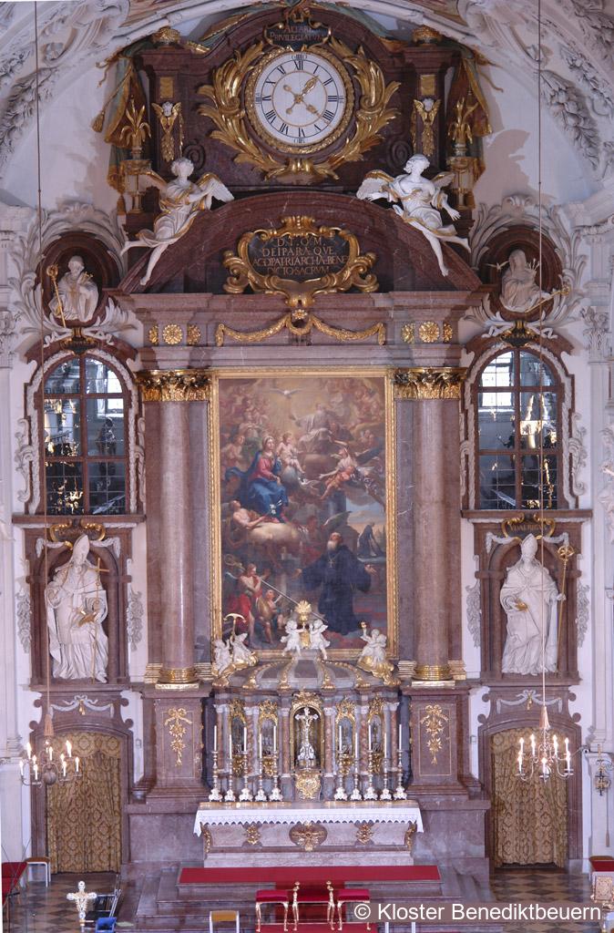 The high altar, including the interior façade of the sacristy and the monk’s choir through the figure niches, is the oldest part of the valuable furnishing of the abbey church with marble altars. In the course of time, the columned aedicule of the retable was supplemented by a tabernacle and a new altarpiece that shows St. Benedict, the founder of the order, together with his sister Scholastica, as well as by an attic, the large clock of which is a reminder of the passing of time.