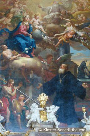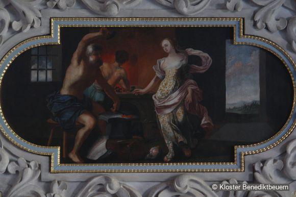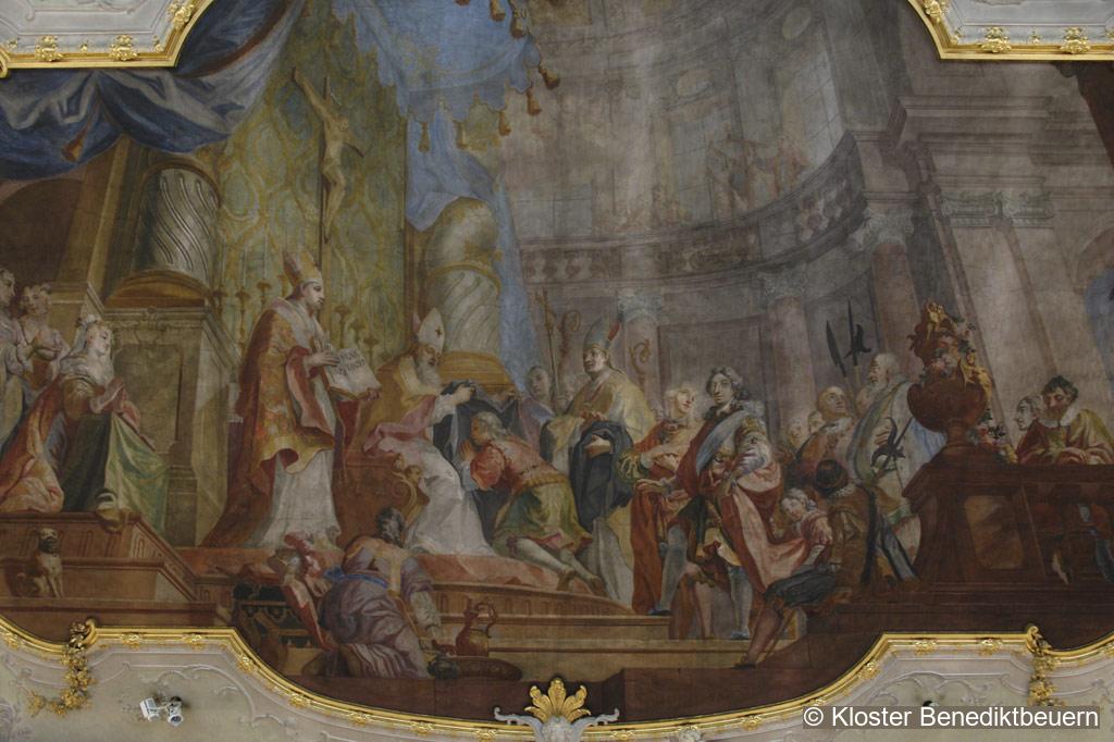 The Festival Hall, ideally conceptualised for the reception of Bavarian electoral princes as sovereigns, is decorated in the courtly Régence style. The central ceiling painting illustrates the establishment of the abbey as if it occurred in the present day at the time. This reinforces the ambivalent relationship between monastic allegiance and welfare provided by the sovereign.