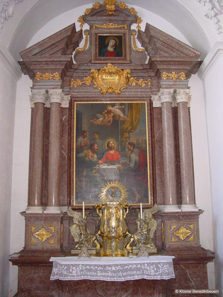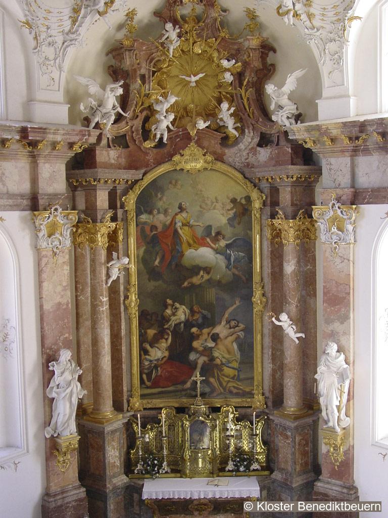 Architecture of the altar: Johann Georg Guggemos (1636–1703); sculptures in niches and angels: Balthasar Ableithner (1614–1705); architecture of the tabernacle: Abbot Eliland Öttl (gov. 1690–1707); tabernacle figures: Roman Anton Boos (1733–1810); attic of the retable: Franz Edmund Doll (1744–1824); altarpiece: Martin Knoller (1725–1804)