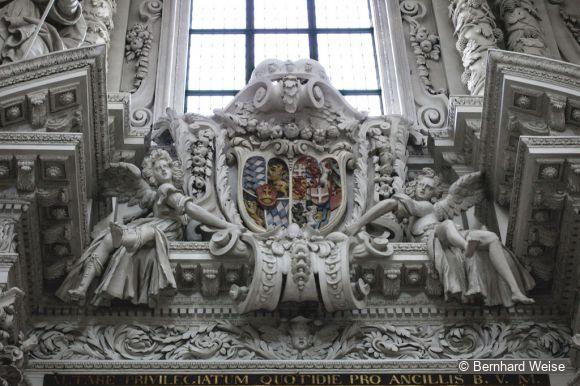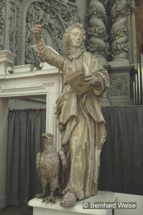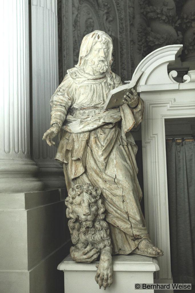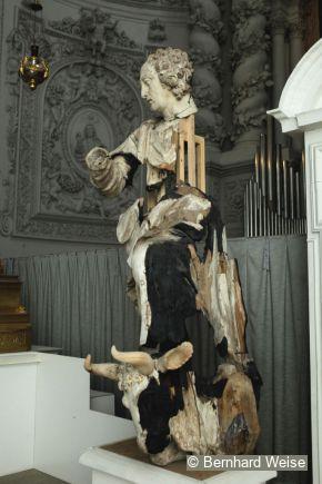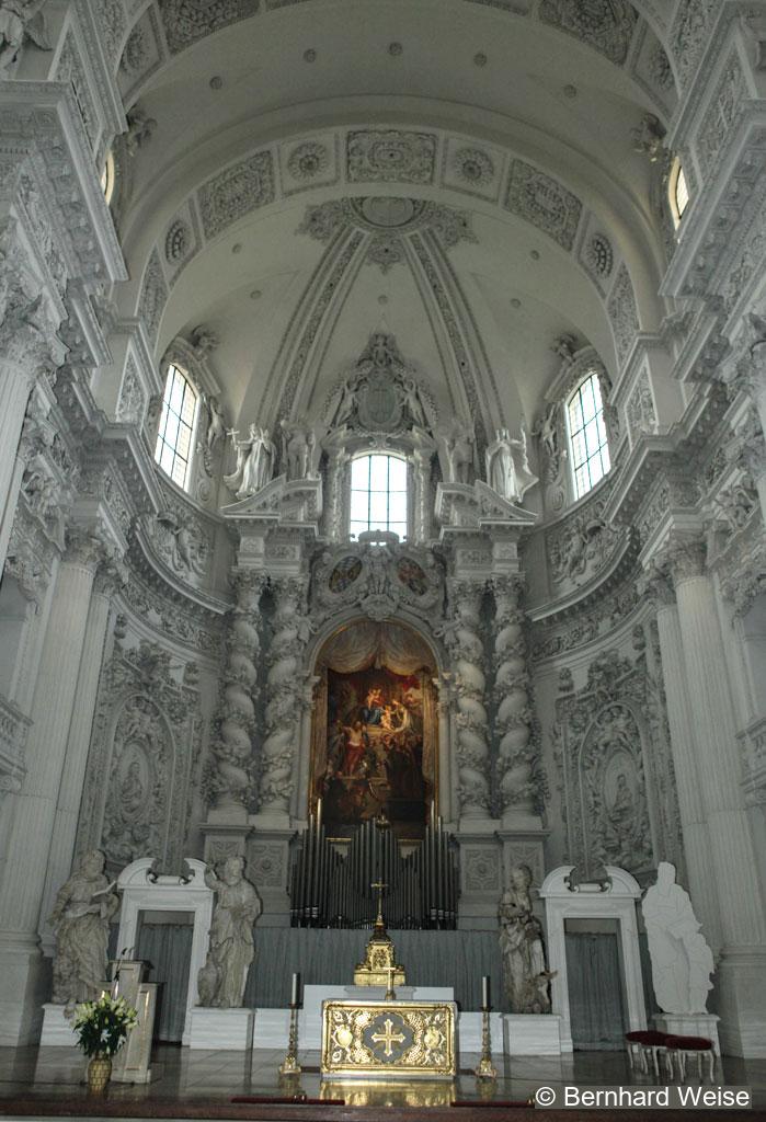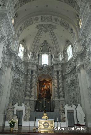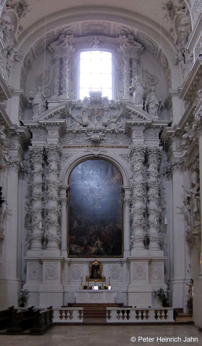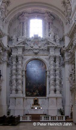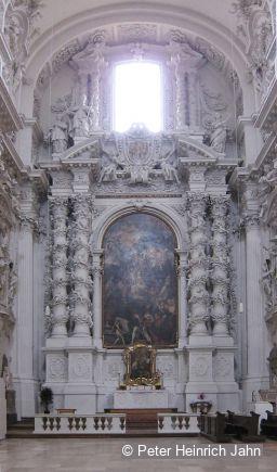 Towards the end of World War II the entire choir area was destroyed by fire, including the high altar, the choir screen and the tabernacle. Of the four evangelist figures flanking the passageways through to the choir, only Marcus, John and Lucas have remained intact. They are counted among the most accomplished Baroque sculptures in Bavaria.