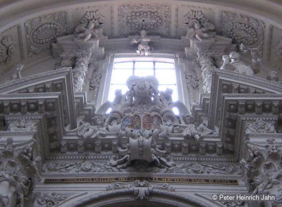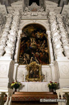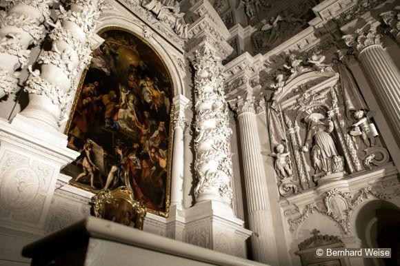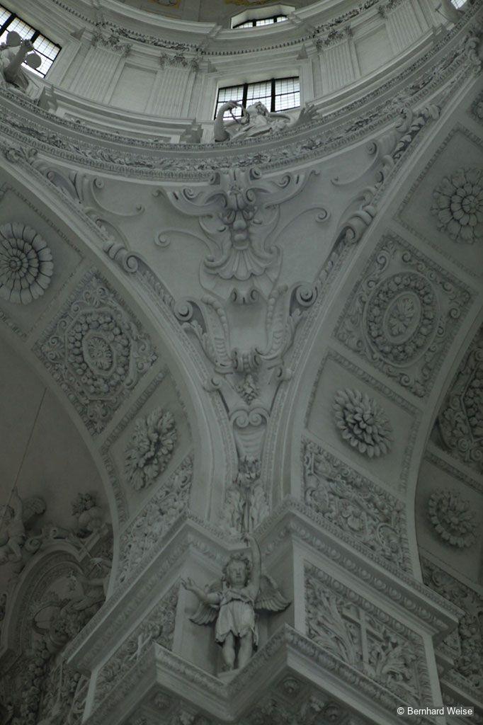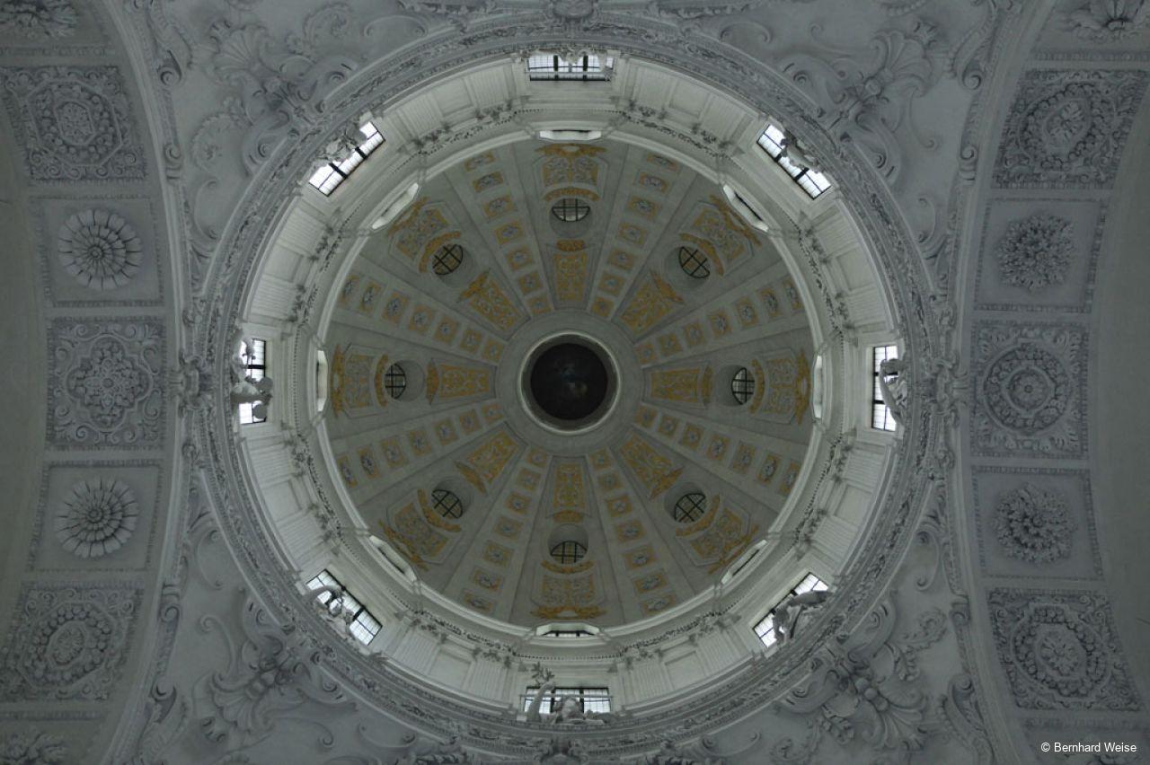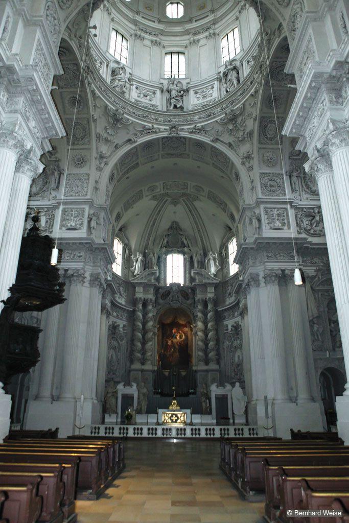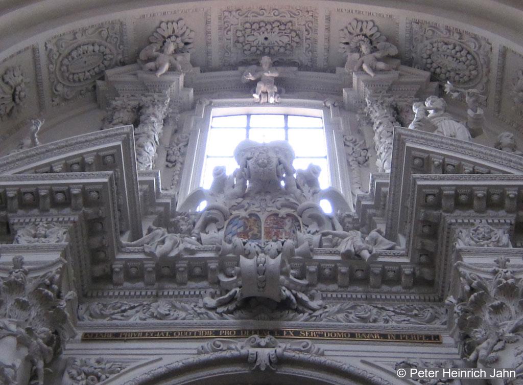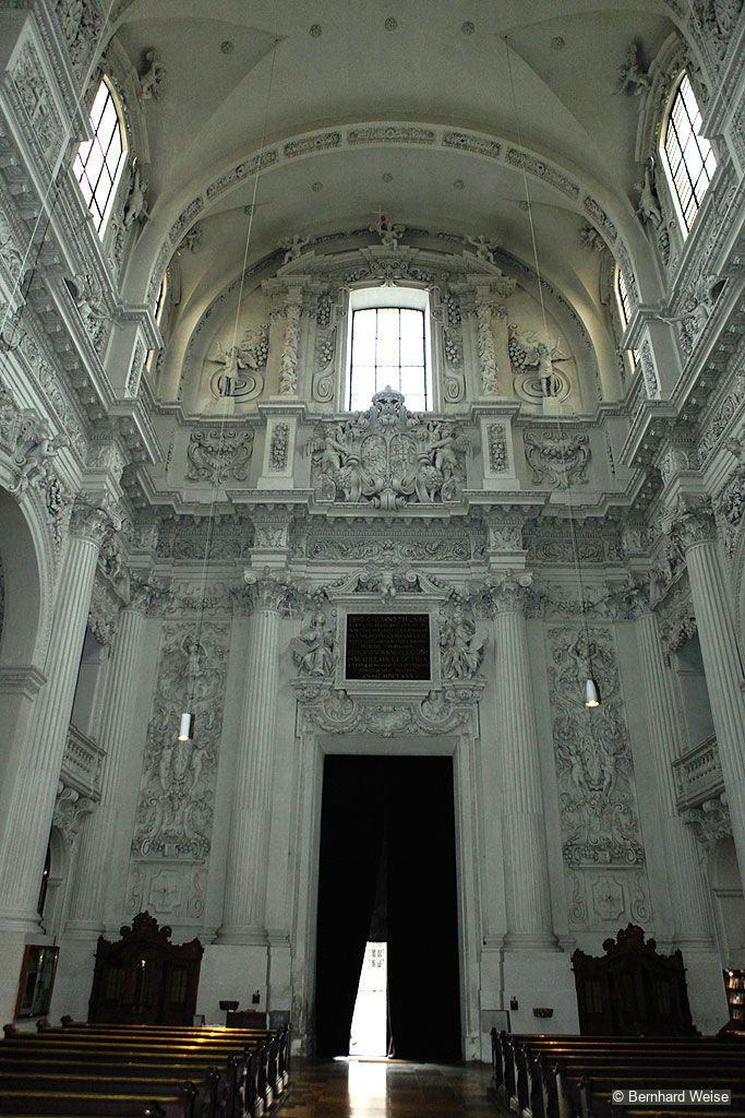 Based on a relatively simple ground plan in crucifix form, the interior has an arrangement similar to the order’s Mater Ecclesia S. Andrea della Valle in Rome. The inner façade mirrors the younger outer one with coat-of-arms and dedication inscription. The impression of grandeur and vastness of space is created by the opulent, colossal columns which fit perfectly the courtly taste for splendour. White stucco dominates the interior of the church and shows an abundance of floral and figural forms. The three-bayed nave and the connected domed side-chapels are illuminated by light from the clerestory and the light that filters in through the large main dome, which, resting on a tambour above the crossing, is separated from the nave and transept by four arches. The highpoints of the interior are the three monumental main altars in the choir and transept, both of which are crowned by stucco figures. Pairs of torsional columns bring about conceptual unity while at the same time professing to the Catholic confession of St. Peter’s Church in Rome.