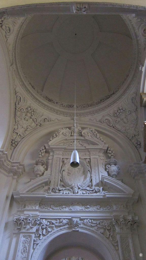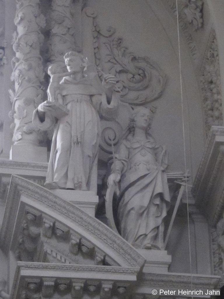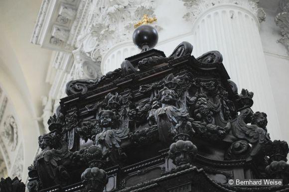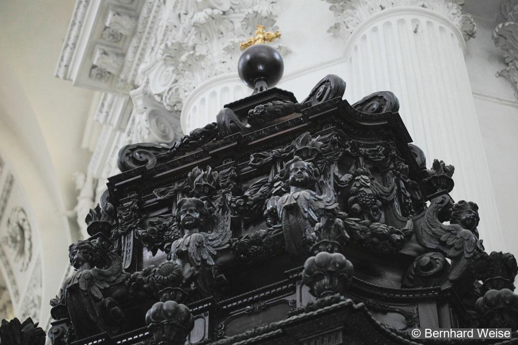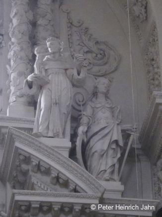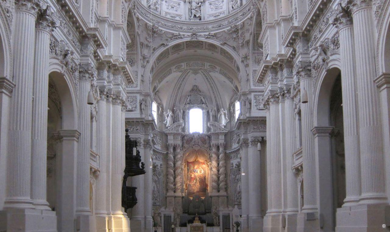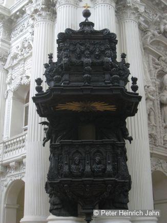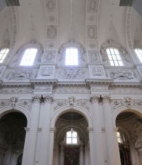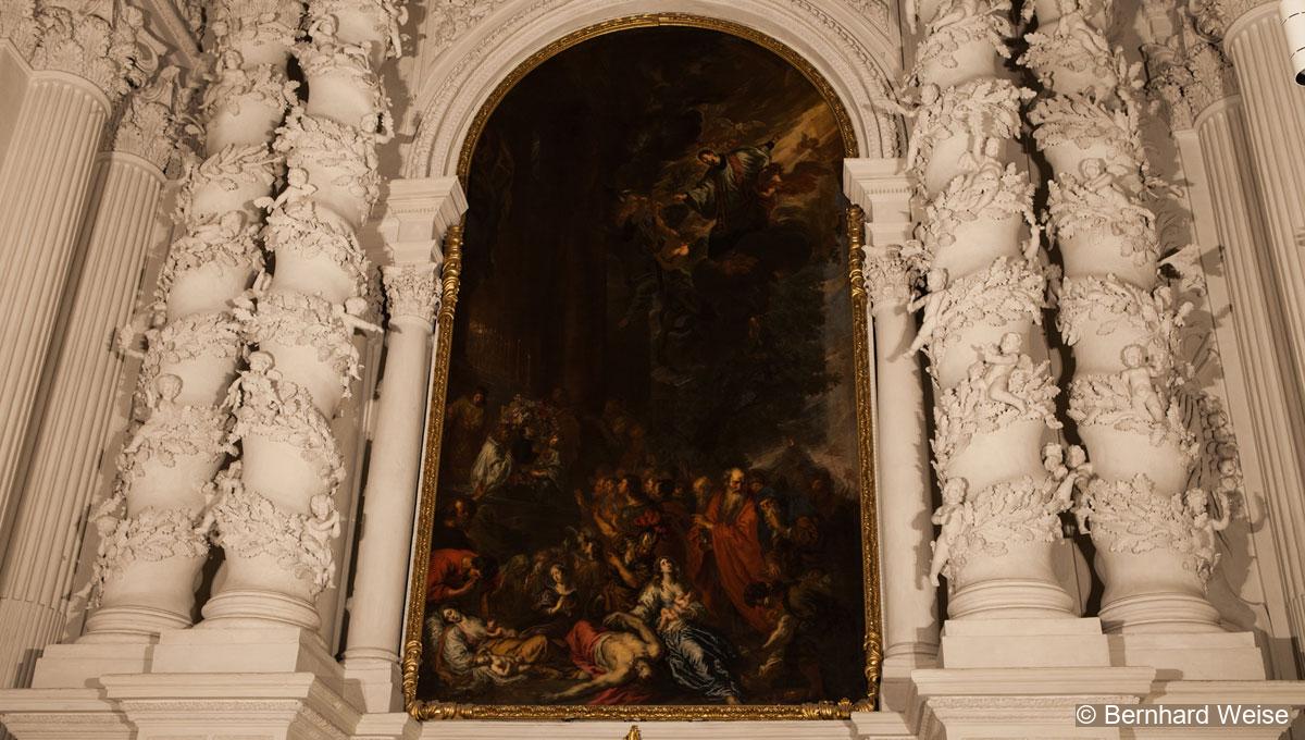 Based on a relatively simple ground plan in crucifix form, the interior has an arrangement similar to the order’s Mater Ecclesia S. Andrea della Valle in Rome. The inner façade mirrors the younger outer one with coat-of-arms and dedication inscription. The impression of grandeur and vastness of space is created by the opulent, colossal columns which fit perfectly the courtly taste for splendour. White stucco dominates the interior of the church and shows an abundance of floral and figural forms. The three-bayed nave and the connected domed side-chapels are illuminated by light from the clerestory and the light that filters in through the large main dome, which, resting on a tambour above the crossing, is separated from the nave and transept by four arches. The highpoints of the interior are the three monumental main altars in the choir and transept, both of which are crowned by stucco figures. Pairs of torsional columns bring about conceptual unity while at the same time professing to the Catholic confession of St. Peter’s Church in Rome.