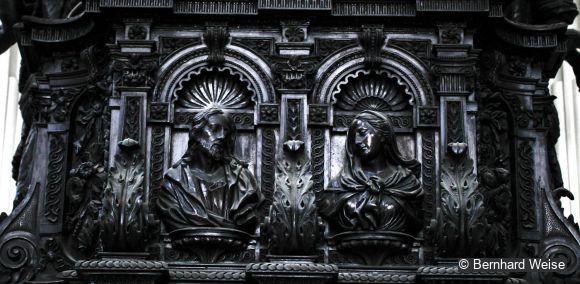 Dark-bated oak pulpit with busts depicting Jesus Christ, the Virgin Mary and Saints Cajetan and Andreas Avellinus.