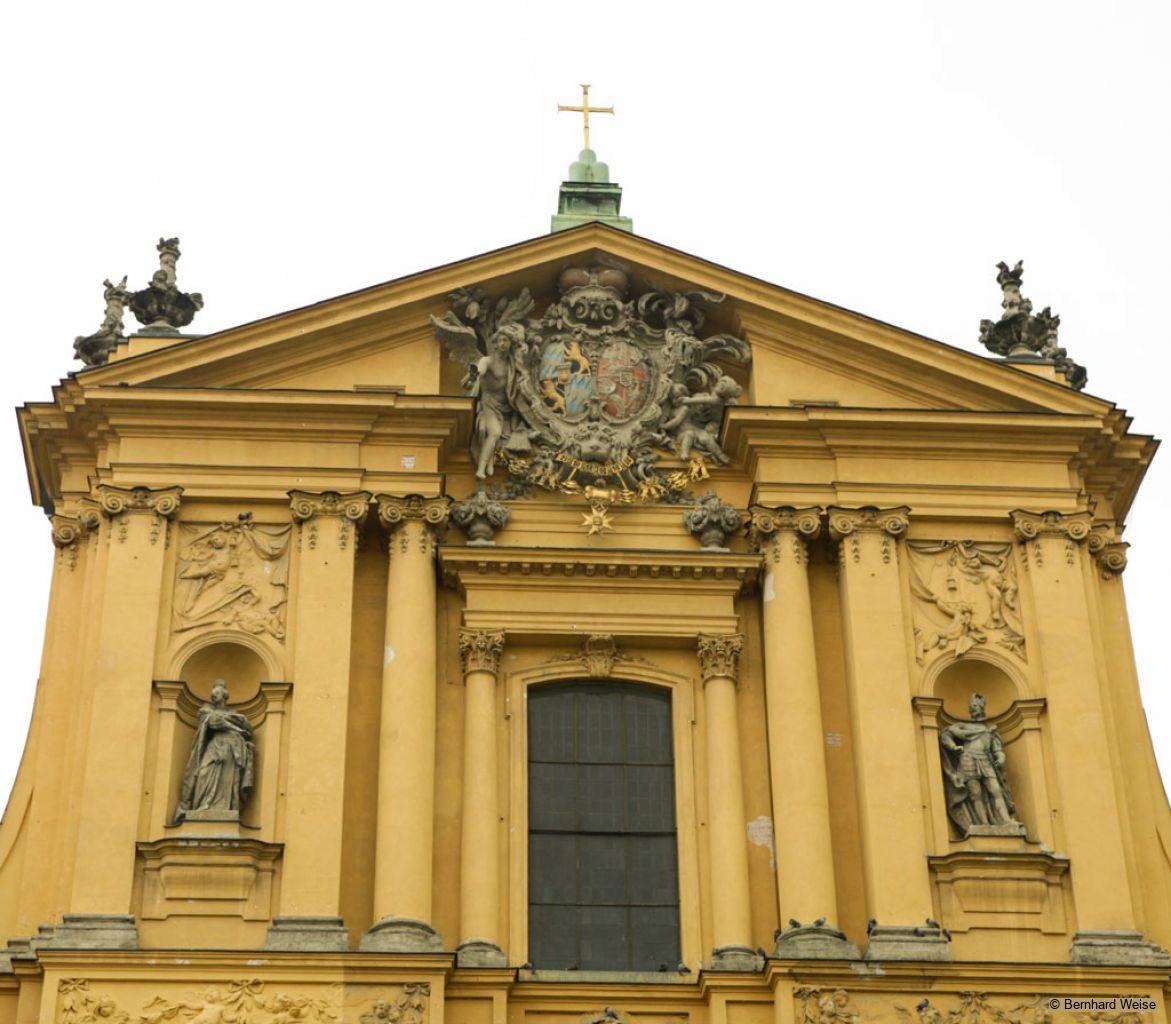 The Theatine church dominates Munich’s Old Town with its two towers and two-level facade. Various statues of saints relevant to the church stand in the façade niches: Cajetan, as founder of the Theatine order and the patron saints of the founding family of Maximilian, Ferdinand and Adelheid, all of which are designed by Ignaz Günther. Above the main portal there is a dedication inscription, and above this the triangular gable bears the coat-of-arms of the Bavarian–Saxon alliance crowned by the so-called Theatine Cross. Two towers with octagonal helm-roofs and volutes adorn the front of the church.