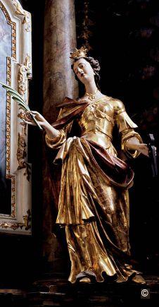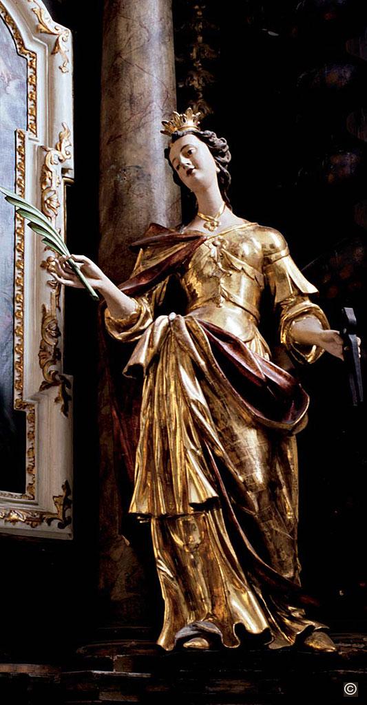 This opulently clad saint holds in her hands the attributes of her the martyrdom, the palm and pincers, which enables us to recognise her as St. Apollonia. Like her companion piece, St. Barbara, she is a characteristic work of Ivan Rosemberger. Rosemberger was prolific, making sculpture of a specific typology and careful in his choice of ornaments. His work set a distinctive stamp on the sculpture of the whole Varaždin region in the first half of the 18th century.