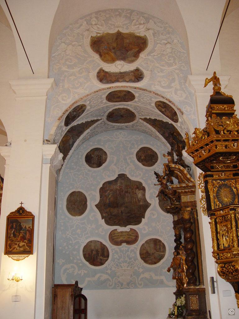 While the stuccowork in Our Lady of the Scapular Chapel facing it is the work of the Styrian practitioner, J. A. Quadrio, the Chapel of St. Anthony has stuccowork made later by an unknown author. Interwoven plants and ribbons frame eight medallions depicting the Life of St. Anthony of Padua, painted by Ivan Krstitelj Ranger, in around 1738.