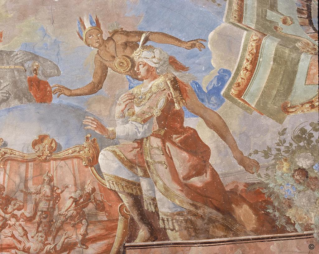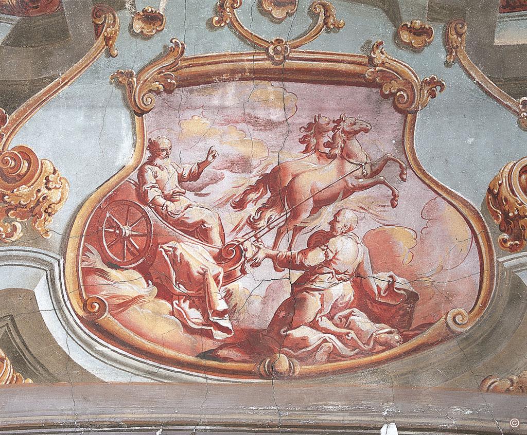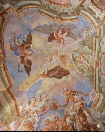The low ceiling is covered with illusionistic paintings: personifications of the Four Continents and allegories of the Four Elements; the Four Stages in man’s life. The Virgin Mary dominates the composition sitting on a rainbow almost in the centre of the ceiling.