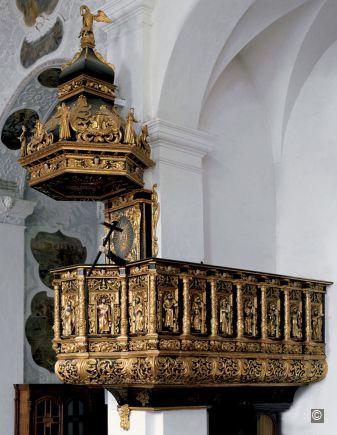 The long body of the pulpit is articulated by the sequencing of little columns, in between which there are niches with figures of Christ and the apostles. The copious employment of ornamental motifs on all surfaces of the pulpit and baldachin, along with the rich, gleaming gilding on the dark ground, are characteristic stylistic features of Late Mannerist Central European woodcarving.
