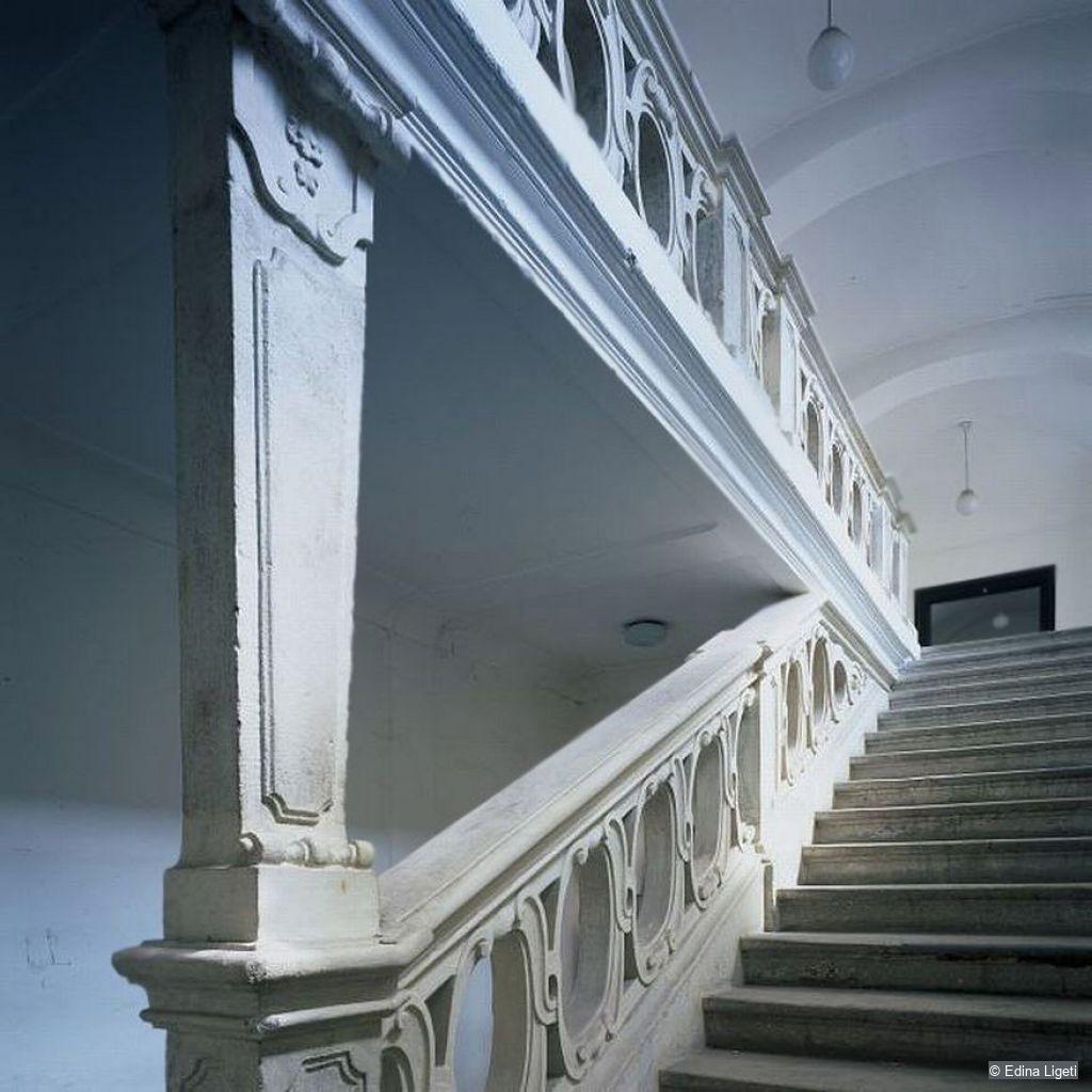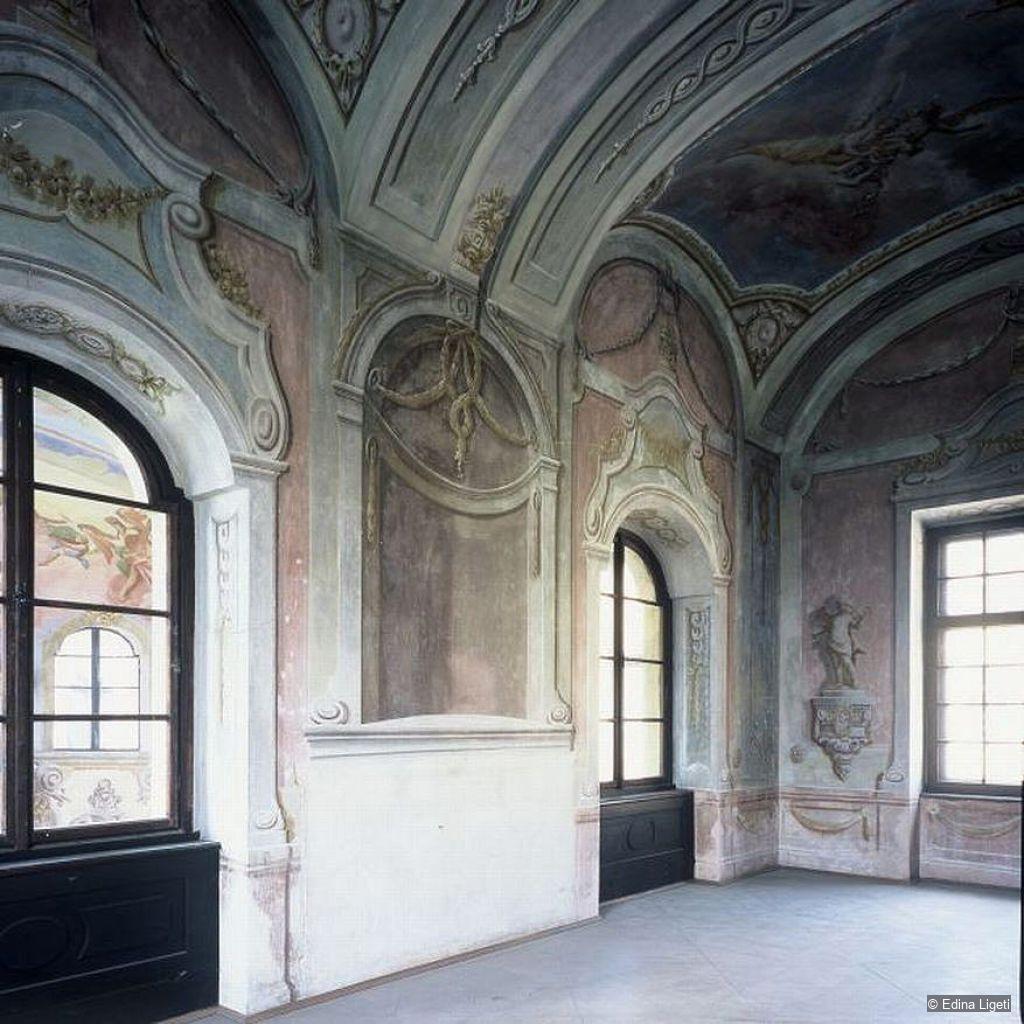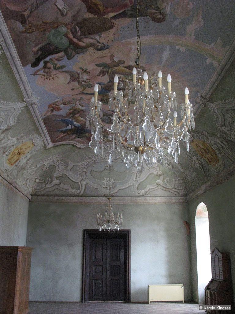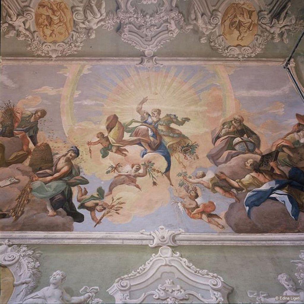 The most representative rooms are those on the second floor of the east wing – built by György Széchenyi – and in the bishop's private apartments in the south wing (its closed balcony was reconstructed in the 1960s). In the banqueting hall (east wing, second floor) there is a magnificent ceiling painting by Caietano di Rosa, an Italian artist working in Austria. Signed and dated (“D. Rosa. F. A. 1745”), the work represents the Veneration of the Seven Liberal Arts in Front of God's Eyes; four grisailles in oval medallions framed with garlands and held by putti: allegorical images of Pallas Athene/Minerva (sciences) Hestia (home, the fireplace), Hephaestus/Vulcan (industry), Hermes/Mercury (trade).