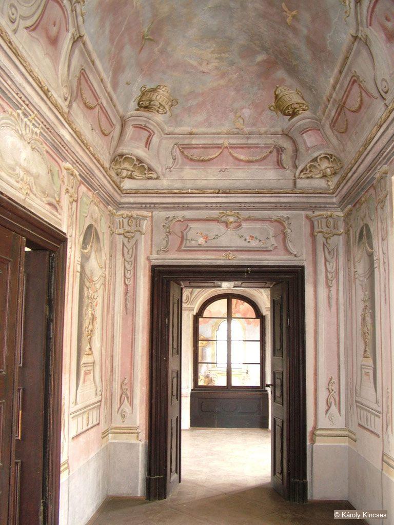 The rooms either side of the banqueting hall have stuccoed Rococo-shell motifs on the ceiling and paintings of vases and garlands on the walls (possibly by Caietano di Rosa and his associates). The walls and ceilings of the corridor, from which rooms lead off, are also painted; on the ceiling of the first part of the corridor is the coat of arms of Bishop Ferenc Zichy upheld by putti, and on the second section, a painted sky is filled with flying birds.
