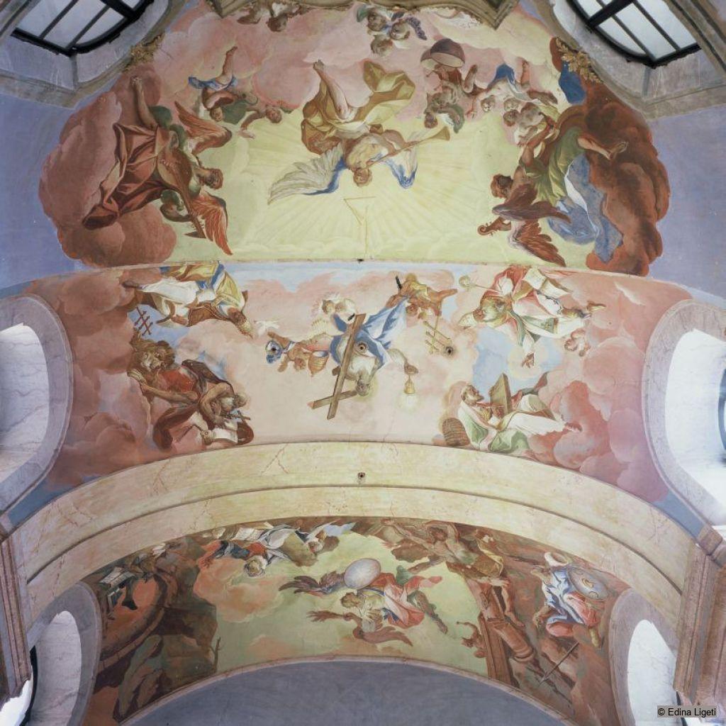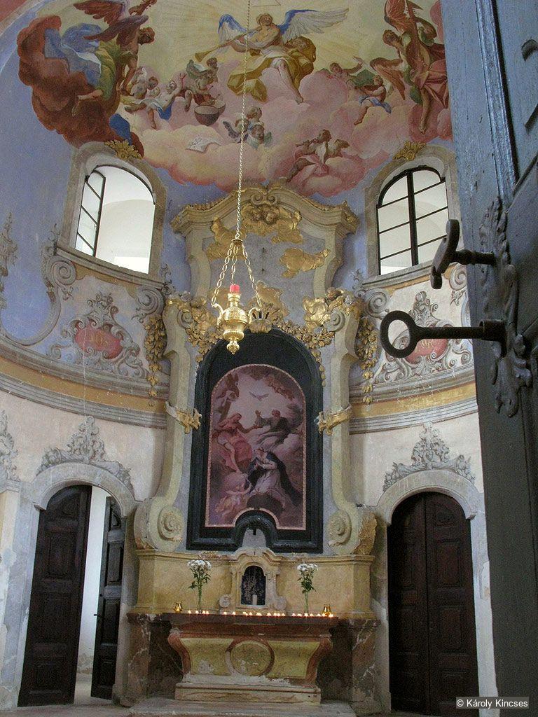 The chapel, two storeys high and half circle-shaped, is also adorned with wall paintings (angels with instruments of the Passion, the Cloth of Veronica, allegorical representations of the Four World Religions; all of which are the works of an unknown 18th-century master restored in 1861 by Ferenc Storno). A copy of the Ascension of the Virgin replaced the original altarpiece painting by the Viennese painter Sigismund Fritsch of 1745. The Rococo furnaces, adorned with gilding and green glaze, are the work of Károly Magner of Győr.