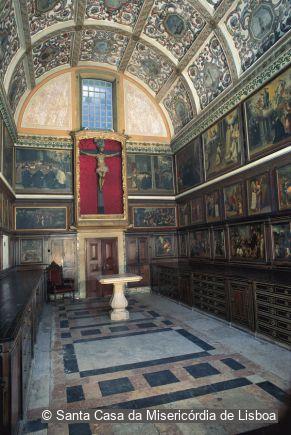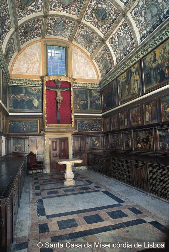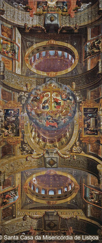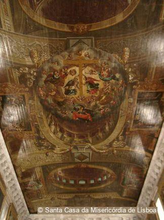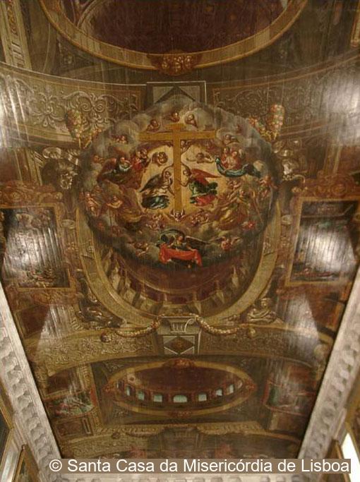 A pintura original, que compreendia apenas elementos arquitectónicos, foi feita pelo pintor espanhol Francisco Venegas, nos finais do século XVI. As cenas bíblicas, inspiradas em gravuras de Antuérpia, foram acrescentadas mais tarde, durante o século XVII, nomeadamente o painel central, O Triunfo da Santa Cruz, atribuído ao pintor português Amaro do Vale.