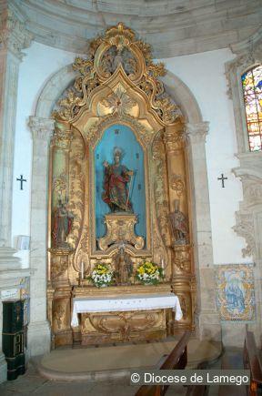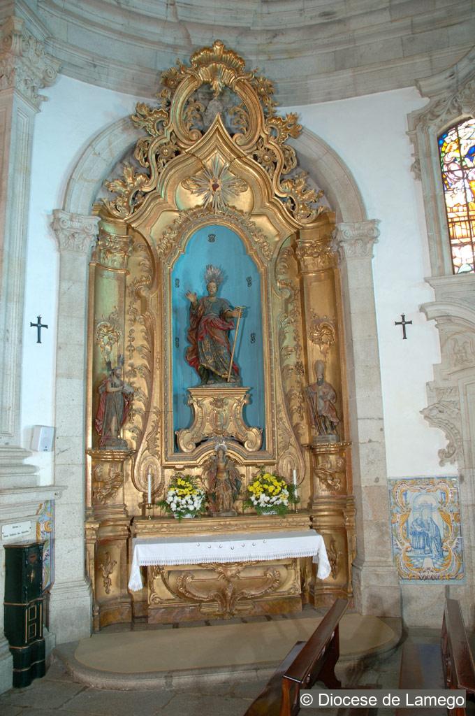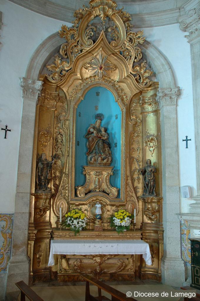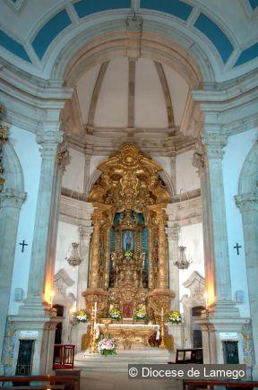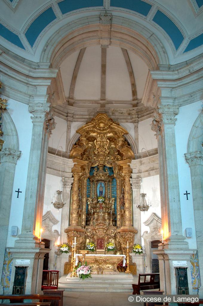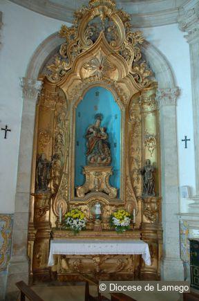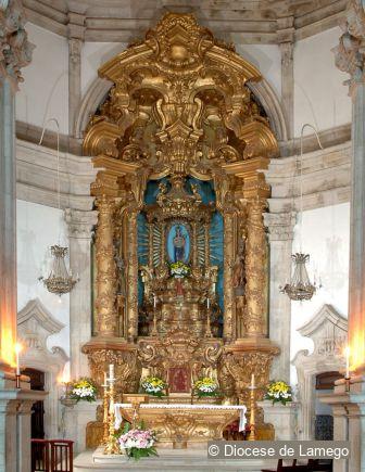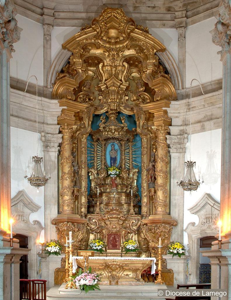 The Main altarpiece is decorated with gilded wood carving in the Rococo style, similar to that of Tibães Monastery, although adapted to a narrower space. The entire structure is elevated. Five steps lead up to the throne occupied by the image of Our Lady that is under a baldachin.