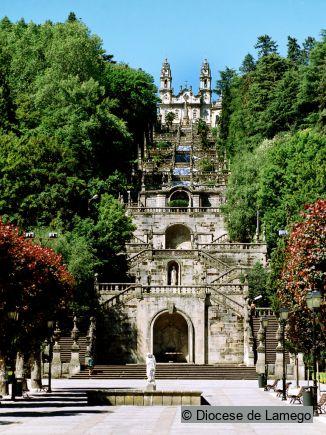 The enormous staircase with 691 stairs crosses the hill to reach the Sanctuary. It has nine profusely decorated levels with pyramids and statues, namely the Courtyard of the Kings and some fountains. The balance and harmony of the church façade are due both to the pinnacled bell tower and to the sculptures crowning the pediment. The framed windows of the façade are decorated with garlands. In the centre of the façade the entrance is decorated with vegetal elements and is surmounted by a niche hosting the image of Our Lady of Remedy.