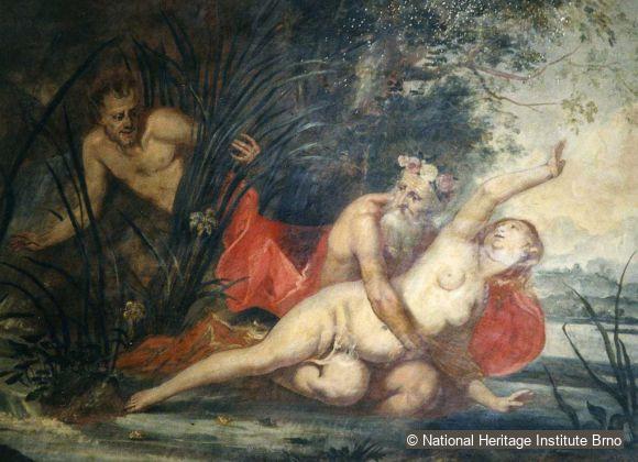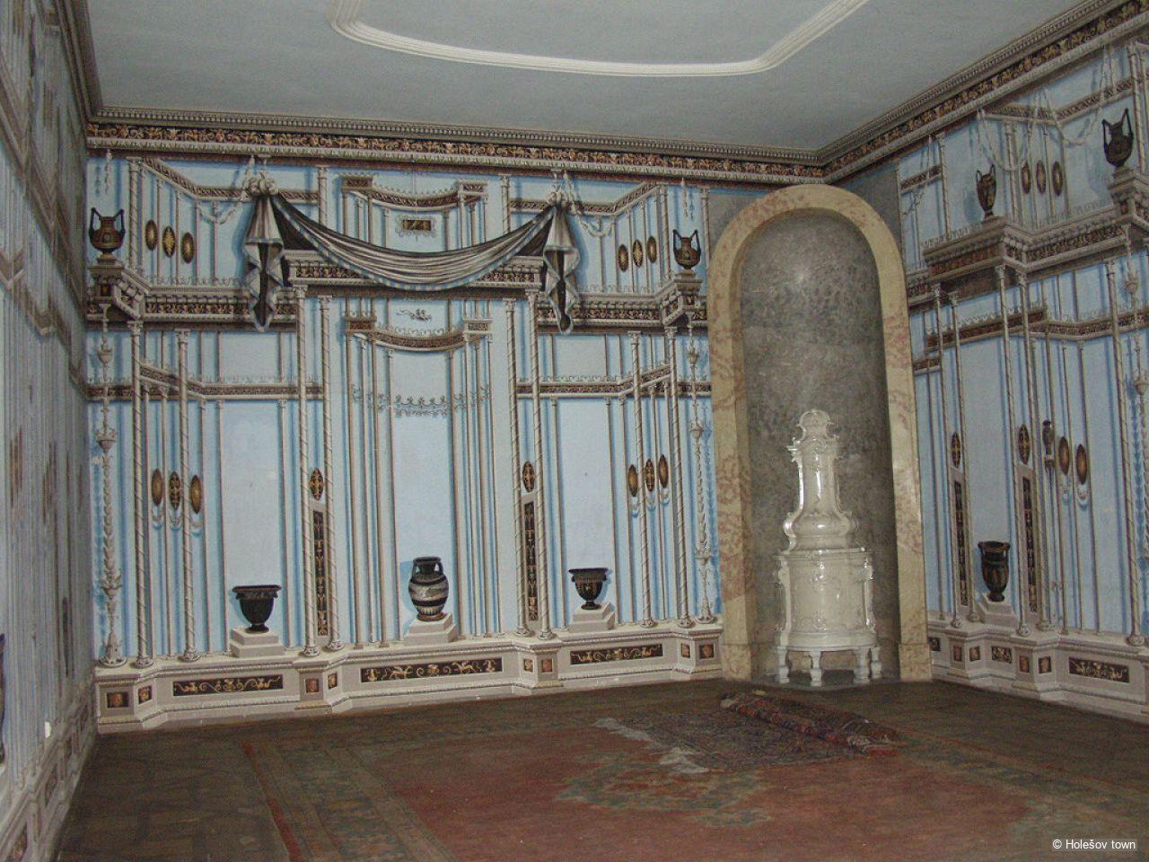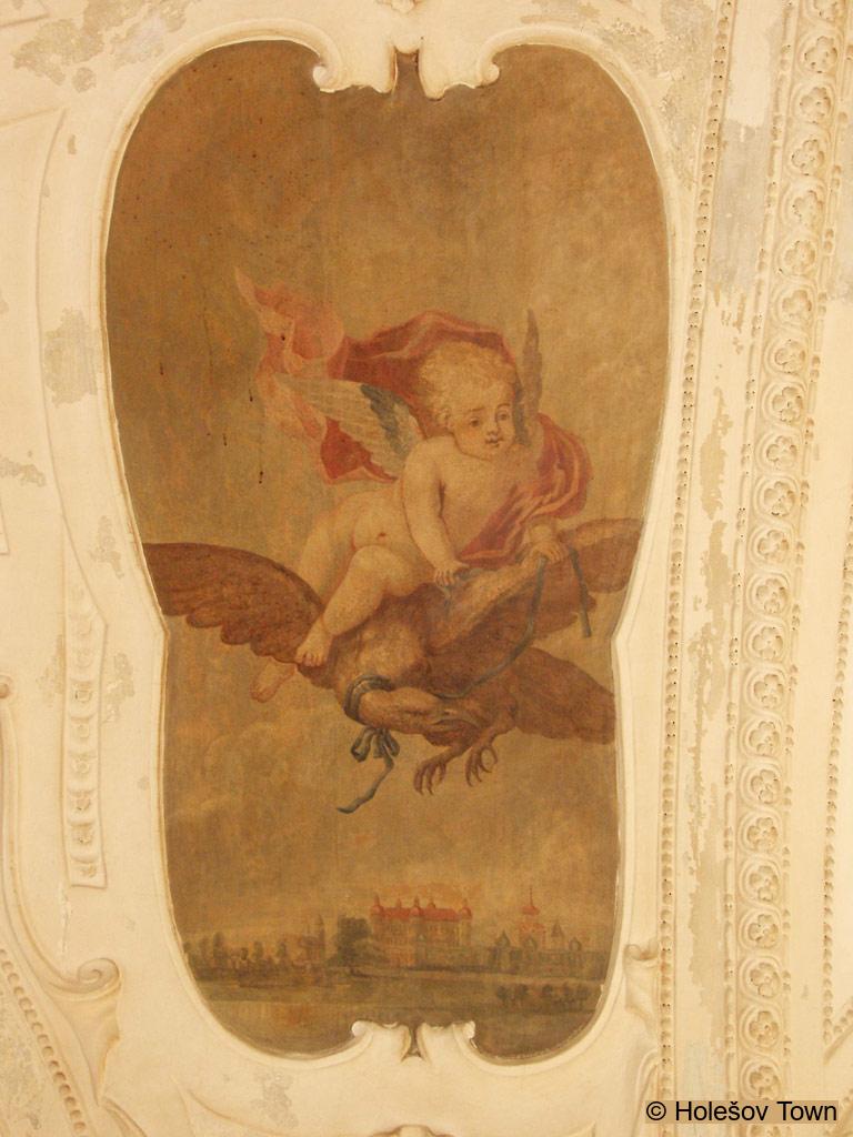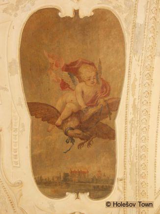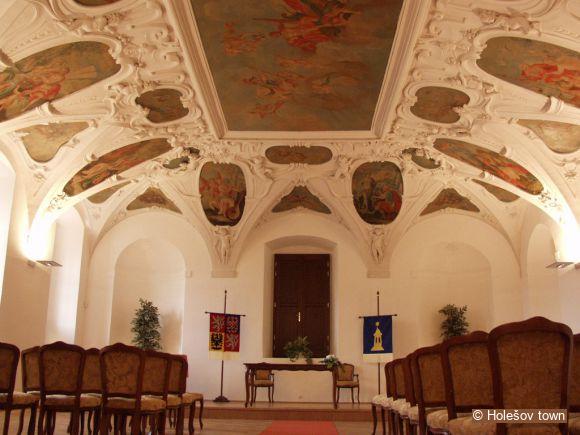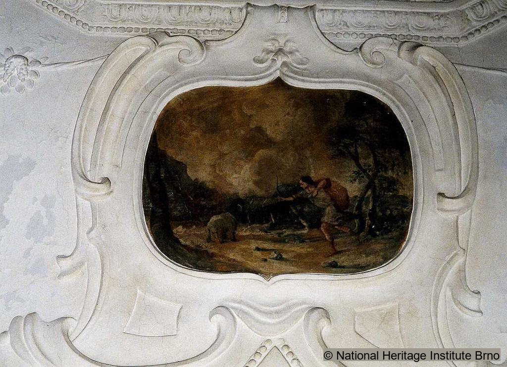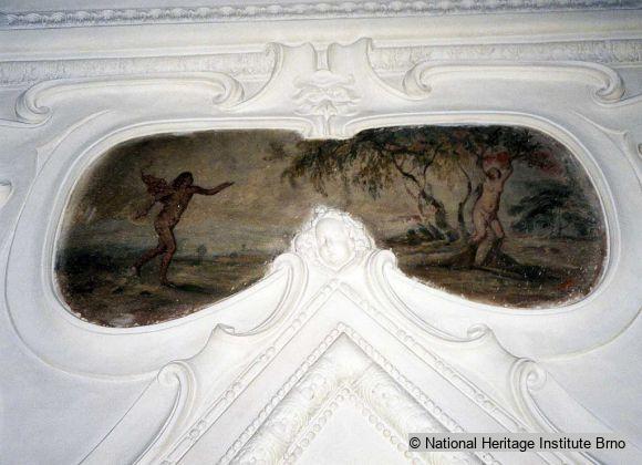 Sál u průjezdu do zahrady je zaklenut neckovou klenbou s výsečemi. Její plochu zdobí podobně jako v patrech zámku štuková výzdoba se zrcadly vyplněnými malovanými výjevy z Ovidiových Proměn, postavami bohyň a Múz s kryptoportréty stavebníků. Konaly se zde hudební produkce, které se staly i vzorem pro zřízení slavného divadla v Jaroměřicích.