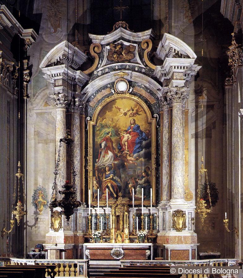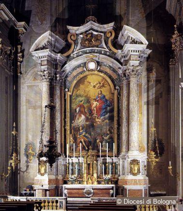 The richly decorated 16th century presbiterium is constructed on a Greek cross plan with three apses and a rectangular space proceeds the choir. It is covered by a groin vault supported by four large Corinthian columns. On the ceiling of the groin vault, above the main altar, is a fresco depicting La Dimora Celeste (“Paradise”) painted by Prospero Fontana in 1579. In the lunette above the altar is the Annunciation (1618) by Ludovico Carracci. The semi-dome above the apse has a painting of Christ Handing the keys to Peter by Cesare Aretusi and Giovanni Battista Fiorini (1579). The Bolognese artists Donato Creti, Marcantonio Franceschini, Vittorio Bigari, Antonio Rossi, Giuseppe Marchesi known as Sansone and Ercole Graziani painted the eighteenth century altarpieces.